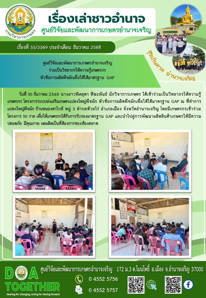 ข่าวกิจกรรม นางสาวพิศสุดา ทีฆะพันธ์ นักวิชาการเกษตร ร่วมเป็นวิทยากรให้ความรู้เกษตรกร โครงการระบบส่งเสริมเกษตรแปลงใหญ่พืชผัก30 ธันวาคม 202530 ธันวาคม 2025
