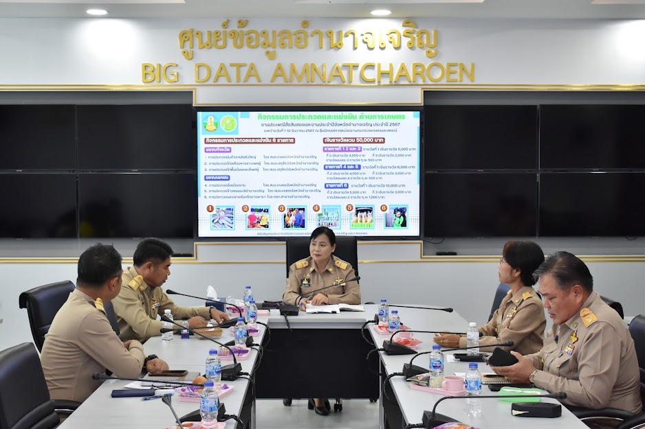 วันจันทร์ที่ 6 ตุลาคม 2568 เวลา 11.00 น. นางสาวรัชดา ปรัชเจริญวนิชย์ ผู้อำนวยการศูนย์วิจัยและพัฒนาการเกษตรอำนาจเจริญ เข้าร่วมหารือการออกร้านจัดแสดงนิทรรศการ การจัดประกวดและแข่งขันด้านการเกษตร ในงานประเพณีฮีตสิบสองและงานประจำปีจังหวัดอำนาจเจริญประจำปี 2568 โดยมีนางปารีณา สอนอาจ เกษตรและสหกรณ์จังหวัดอำนาจเจริญ เป็นประธานฯ ณ ห้องศูนย์ข้อมูลอำนาจเจริญ หน่วยงานกระทรวงเกษตรและสหกรณ์ ได้ติดตามผลการการออกร้านจัดแสดงนิทรรศการ การจัดประกวดและแข่งขันด้านการเกษตร ในงานประเพณีฮีตสิบสองและงานประจำปีจังหวัดอำนาจเจริญประจำปี 2567 ที่ผ่านมา และได้หารือรูปแบบในการออกร้านจัดแสดงนิทรรศการ การจัดประกวดและแข่งขันด้านการเกษตร ในงานประเพณีฮีตสิบสองและงานประจำปีจังหวัดอำนาจเจริญประจำปี 2568 การจัดประกวดและแข่งขันด้านการเกษตร การประกวด มันสำปะหลังหัวใหญ่ มะพร้ามน้ำหอม กล้วยน้ำว้า อ้อยโรงงาน ข้าวหอมมะลิอำนาจเจริญ การประกวดไก่เหลืองหางขาวเพศผู้ การประกวดไก่พื้นเมืองคละสีเพศผู้ การแข่งขันกรีดยางพารา การประกวดเมนูปลาตะเพียน ประกวดแข่งขันมัดหมี่ลายพระราชทาน ลายขอเจ้าฟ้าสิริวัณณวรีฯ กิจกรรมเวทีกลางของแต่ละหน่วยงาน การจำหน่ายสินค้าเกษตรและแปรรูปของเกษตรกรและกลุ่มเกษตรกรในสังกัดกระทรวงเกษตรและสหกรณ์