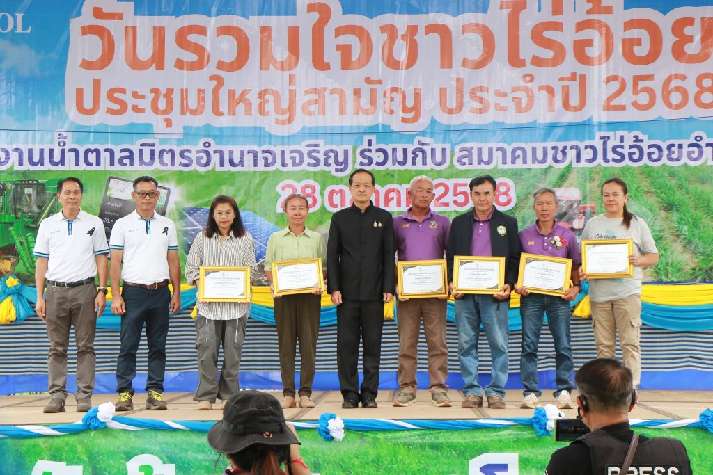 เมื่อวันที่ 28 ตุลาคม 2568 นางสาวรัชดา ปรัชเจริญวนิชย์ ผู้อำนวยการศูนย์วิจัยและพัฒนาการเกษตรอำนาจเจริญ พร้อมด้วยเจ้าหน้าที่ศูนย์ฯ ร่วมงานวันรวมใจชาวไร่อ้อย และประชุมใหญ่สามัญประจำปี เตรียมความพร้อมเข้าสู่ฤดูการผลิต 2568/69 โดยมีนายอนุรัตน์ ธรรมประจำจิต ผู้ว่าราชการจังหวัดอำนาจเจริญ เป็นประธานเปิดงาน ในการจัดงานเพื่อให้เกิดความร่วมมือการประสานงานระหว่างสมาชิกชาวไร่อ้อยโรงงานน้ำตาล และหน่วยงานราชการที่เกี่ยวข้อง เพื่อให้เกษตรกรทราบข้อมูลข่าวสารเกี่ยวกับราคาอ้อยและน้ำตาลทรายทั้งในปัจจุบันและอนาคตอีกทั้งเพื่อให้สมาชิกชาวไร่อ้อยเข้าใจต่อนโยบายของภาครัฐในการตัดอ้อยสด สะอาด คุณภาพดี ส่งเข้าหีบ และมาตรการแก้ไขปัญหาการเผาอ้อยเพื่อลดฝุ่น PM 2.5 ทั้งการบังคับใช้กฎหมาย การส่งเสริมเทคโนโลยีและเครื่องจักรกลการเกษตร ตลอดจนมาตรการส่งเสริมทางการเงิน การสร้างแรงจูงใจ และการสร้างมูลค่าเพิ่มจากใบและยอดอ้อย เพื่อให้ชาวไร่อ้อยได้พบปะแลกเปลี่ยนเรียนรู้ประสบการณ์ ในการทำไร่อ้อยซึ่งกันและกันส่วนการประชุมใหญ่สามัญประจำปีในครั้งนี้ ณ โรงานน้ำตาลมิตรอำนาจเจริญ ตำบลน้ำปลีก อำเภอเมืองอำนาจเจริญ จังหวัดอำนาจเจริญ