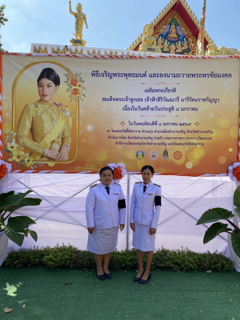 วันที่ 8 มกราคม 2569 นางสาวพิศสุดา ทีฆะพันธ์ นักวิชาการเกษตร พร้อมด้วยนางรุ่งฤดี อดกลั้น เจ้าหน้าที่ธุรการ ร่วมกิจกรรมเฉลิมพระเกียรติสมเด็จพระเจ้าลูกยาเธอเจ้าฟ้าสิริวัณวรี นารีรัตนราชกัญญา เนื่องในโอกาสวันคล้ายวันประสูติ 8 มกราคม 2569 โดยมีนายเสนีย์ ส้มเขียวหวาน ผู้ว่าราชการจังหวัดอำนาจเจริญ เป็นประธาน เพื่อเป็นการแสดงออกถึงความจงรักภักดีและสำนึกในพระมหากรุณาธิคุณ ณ วัดแสนสวัสดิ์ทัศนาราม ตำบลบุ่ง อำเภอเมือง จังหวัดอำนาจเจริญ