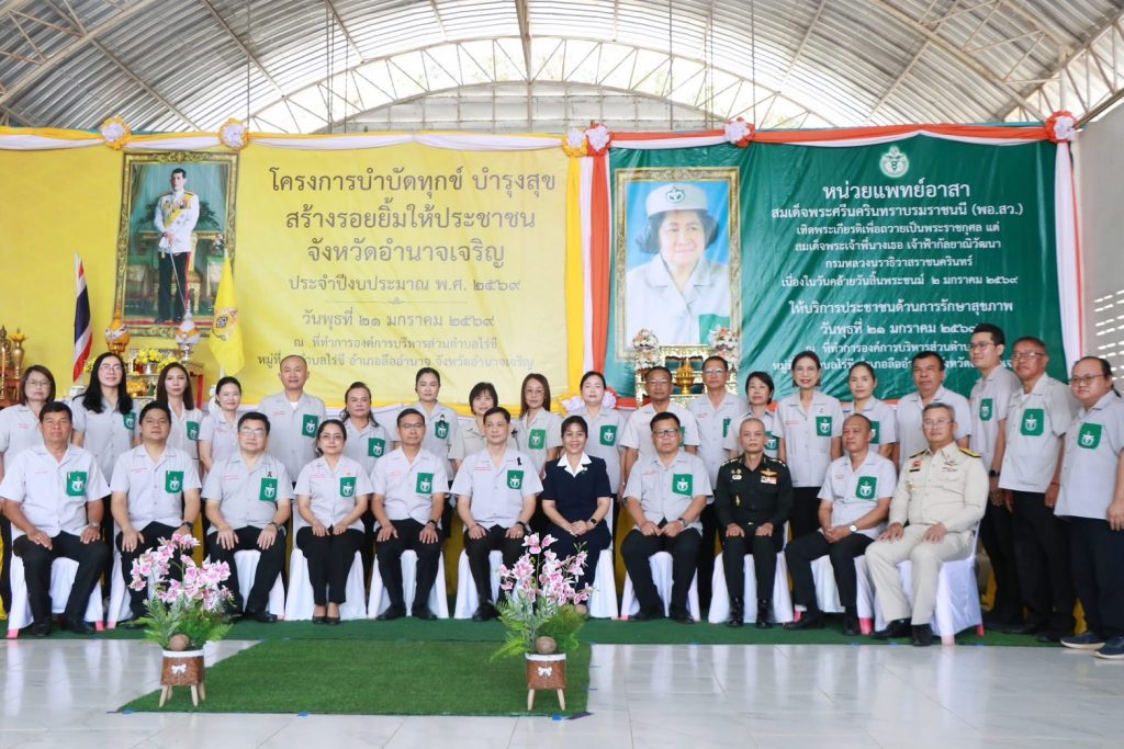 วันที่ 21 มกราคม 2569 นางสาวกรานต์นิภา ไชยราช นักวิชาการเกษตรปฏิบัติการ พร้อมด้วยเจ้าหน้าที่ศูนย์วิจัยและพัฒนาการเกษตรอำนาจเจริญ ร่วมจัดนิทรรศการโครงการบำบัดทุกข์ บำรุงสุข สร้างรอยยิ้มให้ประชาชน จังหวัดอำนาจเจริญ ประจำปีงบประมาณ พ.ศ. 2569 (จังหวัดเคลื่อนที่) โดยมี นายเทพรัตน์ ตันตยานนท์ รองผู้ว่าราชการจังหวัดอำนาจเจริญ เป็นประธาน ณ องค์การบริหารส่วนตำบลไร่ขี หมู่ที่ 4 ตำบลไร่ขี อำเภอลืออำนาจ จังหวัดอำนาจเจริญ เพื่อให้บริการแก่เกษตรกรในพื้นที่ได้เข้าถึงบริการทางการเกษตร ในการแก้ไขปัญหาด้านการเกษตรแบบบูรณาการอย่างครบวงจร อีกทั้งสอดคล้องกับปัญหาความต้องการของเกษตรกร และมอบปัจจัยการผลิตได้แก่ ต้นกล้ามะเขือยาว กวก. พิจิตร 1 ต้นกล้ามะเขือเปราะคางกบ กวก. พิจิตร 1 ต้นกล้ามะละกอ พันธุ์แขกดำศรีสะเกษ ท่อนพันธุ์อ้อยคั้นน้ำ พันธุ์ศรีสำโรง 1 และท่อนพันธุ์มันสำปะหลัง พันธุ์ระยอง 72 และเอกสารทางวิชาการด้านการปลูกพริก ถั่วเขียว และมันสำปะหลัง