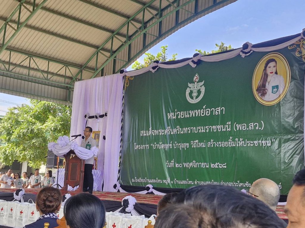 วันที่ 20 พฤศจิกายน 2568 นางรัตน์ติยา พวงแก้ว ผู้อำนวยการศูนย์วิจัยและพัฒนาการเกษตรบุรีรัมย์ มอบหมายให้นายศักดินันท์ จันทคณานุรักษ์ นักวิชาการเกษตรปฏิบัติการ พร้อมด้วยเจ้าหน้าที่งาน พ.ร.บ. ศวพ.บุรีรัมย์ ร่วมออกหน่วยบริการแพทย์อาสาสมเด็จพระศรีนครินทราบรมราชชนนี (พอ.สว.) โครงการ บำบัดทุกข์ บำรุงสุข วิถีใหม่ สร้างรอยยิ้มให้ประชาชน ประจำเดือน พฤศจิกายน 2568 ณ โรงเรียนบ้านแสลงโทน หมู่ที่ 1 บ้านแสลงโทน ต.แสลงโทน อ.ประโคนชัย จ.บุรีรัมย์ โดยมีนายศรีธรรม ราชแก้ว รองผู้ว่าราชการจังหวัดบุรีรัมย์ เป็นประธานในพิธีเปิดกิจกรรม มีผู้เข้าร่วมกิจกรรมครั้งนี้ประมาณ 200 คน