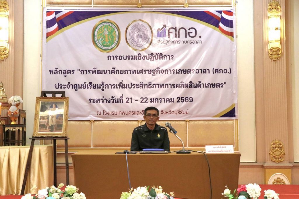 วันที่ 21 มกราคม 2569 นางรัตน์ติยา พวงแก้ว ผู้อำนวยการศูนย์วิจัยและพัฒนาการเกษตรบุรีรัมย์ ร่วมพิธีเปิดการฝึกอบรมเชิงปฏิบัติการ หลักสูตรการพัฒนาศักยภาพเศรษบกิจการเกษตรอาสา (ศกอ.) ประจำศูนย์เรียนรู้การเพิ่มประสิทธิภาพการผลิตสินค้าเกษตร ประจำปีงบประมาณ พ.ศ.2569 ณ โรงแรมเทพนคร อ.เมือง จ.บุรีรัมย์