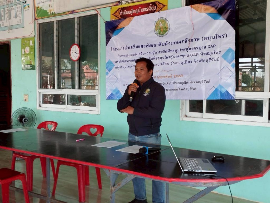 วันที่ 11 กุมภาพันธ์ 2569 นางรัตน์ติยา พวงแก้ว ผู้อำนวยการศูนย์วิจัยและพัฒนาการเกษตรบุรีรัมย์ มอบหมายให้เจ้าหน้าที่งานตรวจรับรองศวพ.บุรีรัมย์ ร่วมกับสํานักงานเกษตรและสหกรณ์จังหวัดบุรีรัมย์ จัดกิจกรรมอบรมส่งเสริมความรู้การผลิตพืชสมุนไพรสู่มาตรฐาน GAP ภายใต้กิจกรรมพัฒนาการผลิตพืชสมุนไพรสู่มาตรฐาน GAP พืชสมุนไพร ณ ศาลาประชาคมบ้านสระขี้ตุ่น ต.ปะเคียบ อ.คูเมือง จ.บุรีรัมย์ มีเกษตรกรเข้าร่วมอบรม จำนวน 30 ราย และออกตรวจให้การรับรองแปลงใหม่ GAP พืช (แปลง MOU) จำนวน 28 แปลง ณ แปลงเกษตรกร อ.คูเมือง จ.บุรีรัมย์