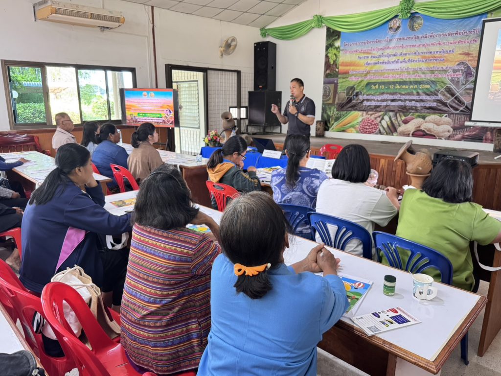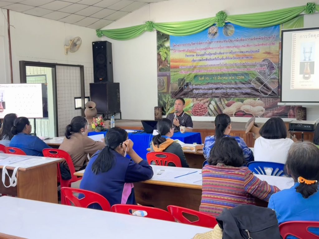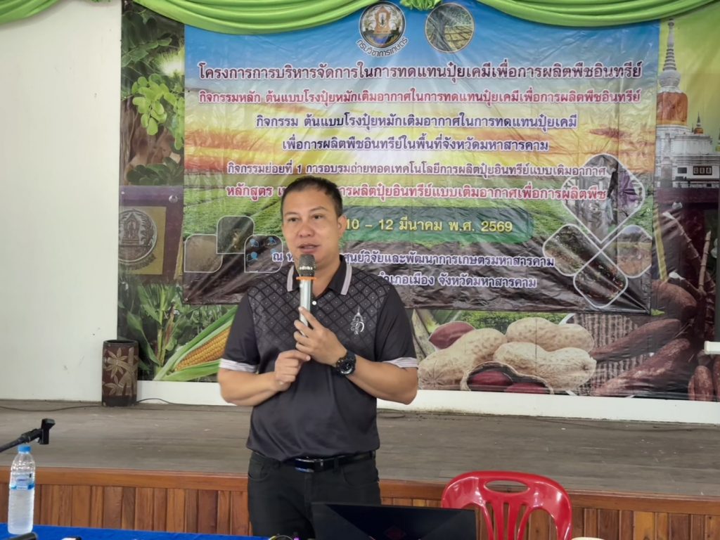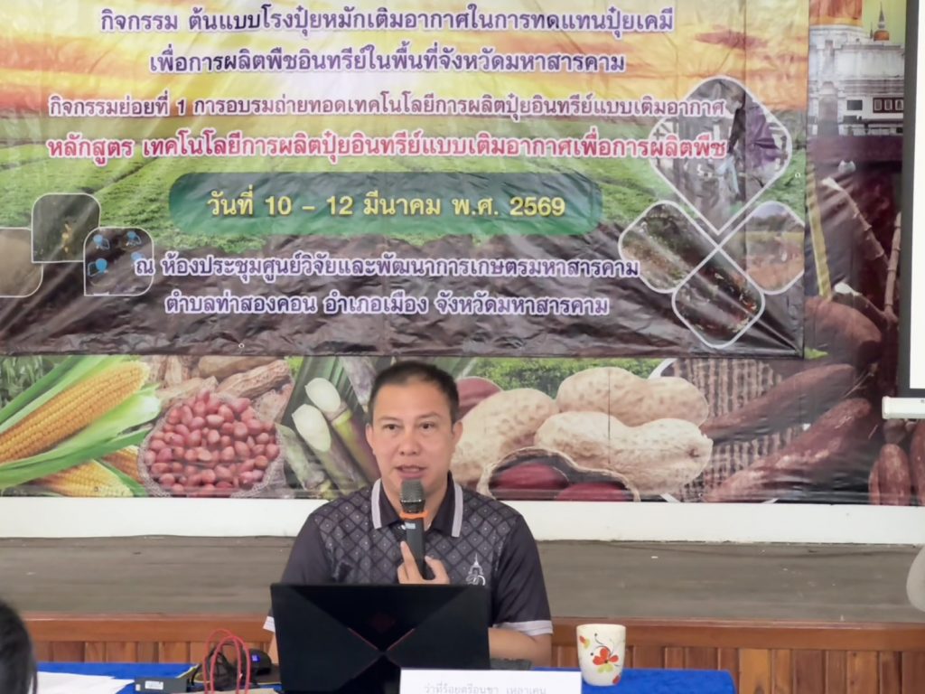 วันพุธที่ 11 มีนาคม 2569 นายนิพนธ์ ภาชนะวรรณ ผู้อำนวยการศูนย์วิจัยและพัฒนาการเกษตรมหาสารคาม มอบหมายให้ ว่าที่ ร.ต.ดร.อนุชาเหลาเคน นักวิชาการเกษตรชำนาญการ และคณะ จัดฝึกอบรมเกษตรกร โครงการการบริหารจัดการในการทดแทนปุ๋ยเคมีเพื่อการผลิตพืชอินทรีย์ กิจกรรมต้นแบบปุ๋ยหมักเติมอากาศเพื่อการผลิตพืชอินทรีย์ในพื้นที่จังหวัดมหาสารคาม กิจกรรมย่อยที่ 1 การอบรมถ่ายทอดเทคโนโลยีการผลิตปุ๋ยอินทรีย์แบบเติมอากาศเพื่อการผลิตพืช รุ่นที่ 2 ณ ห้องประชุม ศูนย์วิจัยและพัฒนาการเกษตรมหาสารคาม ตำบลท่าสองคอน อำเภอเมืองมหาสารคาม จังหวัดมหาสารคาม โดยมีเกษตรกรเข้ารับการฝึกอบรมจำนวน 50 ราย