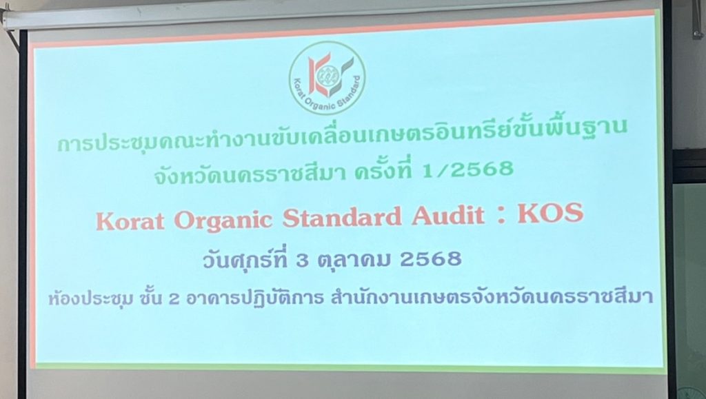 วันที่ 3 ตุลาคม 2568 นางวราภรณ์ อุดมดี ผู้อำนวยการศูนย์วิจัยและพัฒนาการเกษตรโนนสูง และนางสาวจรีรัตน์ ไชยรัตน์ เจ้าพนักงานการเกษตรปฏิบัติงาน ร่วมประชุมคณะทำงานขับเคลื่อนเกษตรอินทรีย์ขั้นพื้นฐาน จังหวัดนครราชสีมา (Korat Organic Standard :KOS) ครั้งที่ 1/2568 เพื่อให้เกษตรกรที่ผ่านการตรวจประเมินแปลงจากคณะทำงานฯได้รับการรับรองมาตรฐาน เป็นการยืนยันกระบวนการผลิตที่ไม่ใช้สารเคมี โดยมี นายกิตติศักดิ์ ธีระวัฒนา รองผู้ว่าราชการจังหวัดนครราชสีมา เป็นประธานการประชุม ร่วมกับหัวหน้าส่วนราชการและผู้แทนจากหน่วยงานต่าง ๆ ณ ห้องประชุม ชั้น 2 อาคารปฏิบัติการ สำนักงานเกษตรจังหวัดนครราชสีมา ตำบลโคกกรวด อำเภอเมืองนครราชสีมา จังหวัดนครราชสีมา