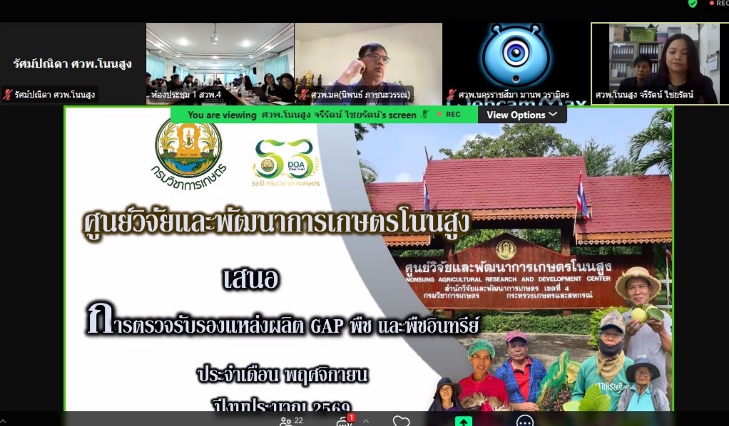 วันที่ 20 พฤศจิกายน 2568 ศูนย์วิจัยและพัฒนาการเกษตรโนนสูง นำโดย นางวราภรณ์ อุดมดี ผู้อำนวยการศูนย์ฯ เข้าร่วมประชุมคณะกรรมการรับรองมาตรฐานแหล่งผลิต GAP พืช และแหล่งผลิตพืชอินทรีย์ ณ ห้องประชุม 1 สำนักวิจัยและพัฒนาการเกษตร เขตที่ 4 อำเภอสว่างวีระวงศ์ จังหวัดอุบลราชธานี พร้อมกันนี้ นางสาวจรีรัตน์ ไชยรัตน์ เจ้าพนักงานการเกษตรปฏิบัติงาน และเจ้าหน้าที่ตรวจรับรองแหล่งผลิต GAP พืช และพืชอินทรีย์ ได้ร่วมประชุมผ่านระบบออนไลน์ โดยมี นายขจรวิทย์ พันธ์ยางน้อย ผู้อำนวยการสำนักวิจัยและพัฒนาการเกษตร เขตที่ 4 เป็นประธานการประชุม