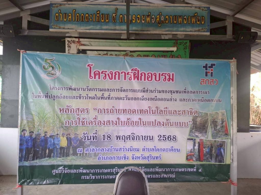 นางสาวนิรมล ดำพะธิก ผู้อำนวยการศูนย์วิจัยและพัฒนาการเกษตรสุรินทร์ มอบหมายให้ นายสุชาติ แก้วกมลจิต นักวิชาการเกษตรชำนาญการพิเศษ พร้อมด้วยเจ้าหน้าที่ ศูนย์วิจัยฯ จัดฝึกอบรมโครงการพัฒนานวัตกรรมและการจัดการแบบมีส่วนร่วมของชุมชนเพื่อลดการเผา ในพื้นที่ปลูกอ้อยและข้าวโพด ในพื้นที่ภาคตะวันออกเฉียงเหนือตอนล่าง และภาคเหนือตอนบน หลักสูตร การถ่ายทอดเทคโนโลยีและสาธิต การใช้เครื่องสางใบอ้อยในแปลงต้นแบบ มีเกษตรกรผู้เข้าอบรม จำนวน 30 ราย ณ ศาลากลางบ้านสว่างนิยม ตำบลโคกตะเคียน อำเภอกาบเชิง จังหวัดสุรินทร์