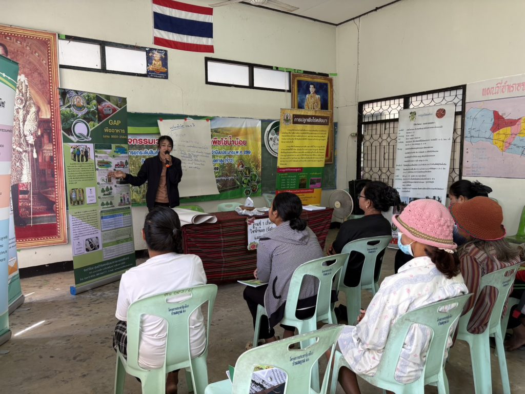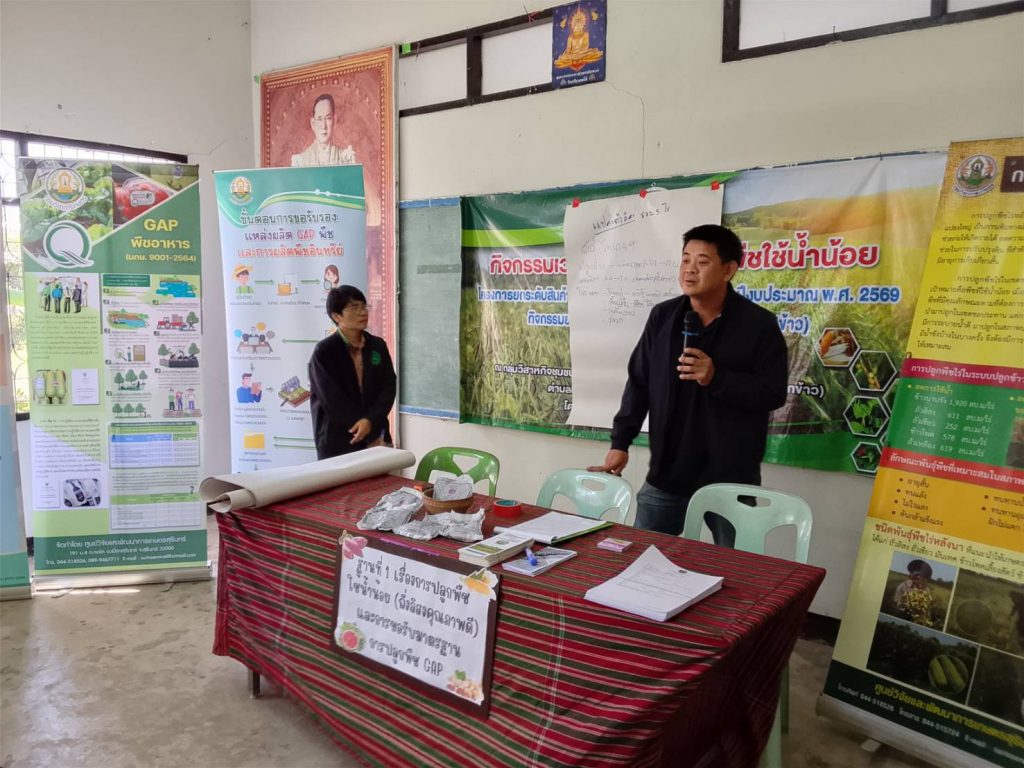 นางสาวนิรมล ดำพะธิก ผู้อำนวยการศูนย์วิจัยและพัฒนาการเกษตรสุรินทร์ มอบหมายให้ นางสาวจิรัสชญาพร รณเรืองฤทธิ์ นักวิชาการเกษตรชำนาญการ พร้อมด้วย เจ้าหน้าที่ ศูนย์วิจัยฯ สุรินทร์ ร่วมเป็นวิทยากร เรื่อง การปลูกพืชใช้น้ำน้อย (ถั่วลิสงคุณภาพดี) และการขอรับรองมาตรฐานการปลูกพืช GAP กิจกรรมเวทีเรียนรู้การปลูกพืชใช้น้ำน้อย โครงการยกระดับสินค้าเกษตรและบริการมูลค่าสูง ประจำปีงบประมาณ พ.ศ. 2569 กิจกรรมยกระดับสินค้าเกษตรและบริการมูลค่าสูง (ข้าว) ณ กลุ่มวิสาหกิจชุมชนเกษตรผสมผสานบ้านสมบูรณ์ (เกษตรกรผู้ปลูกข้าว) ตำบลแสง อำเภอจอมพระ จังหวัดสุรินทร์ โดย สำนักงานเกษตรและสหกรณ์จังหวัดสุรินทร์ จำนวน เกษตรกร 30 ราย