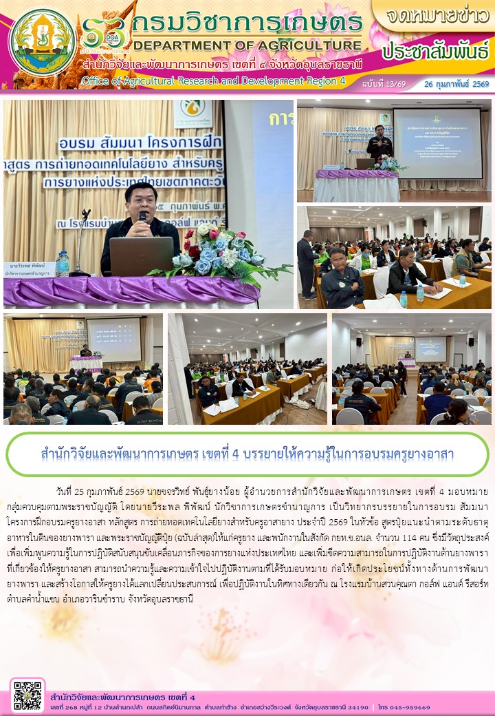ข่าวกิจกรรม สำนักวิจัยและพัฒนาการเกษตร เขตที่ 4 บรรยายให้ความรู้ในการอบรมครูยางอาสาโดย กิตติภัทร บุคจำปา วันที่ 26 กุมภาพันธ์ 2569 1 อ่านเพิ่มเติม→