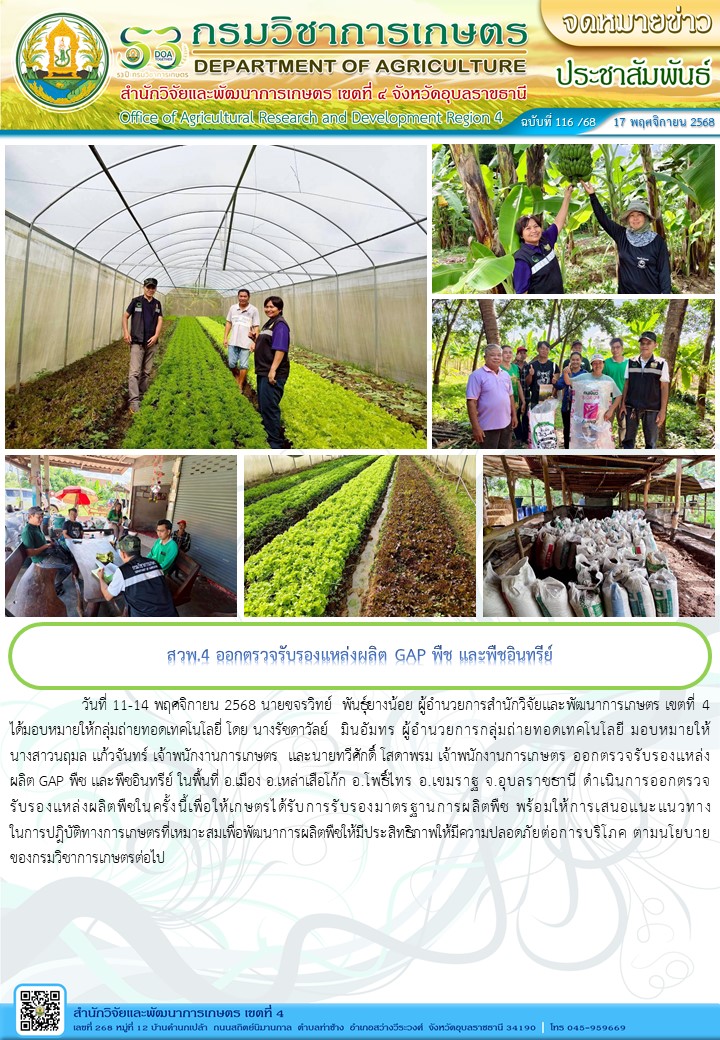 ข่าวกิจกรรม สวพ.4 ออกตรวจรับรองแหล่งผลิต GAP พืช และพืชอินทรีย์โดย กิตติภัทร บุคจำปา วันที่ 17 พฤศจิกายน 2568 9 อ่านเพิ่มเติม→