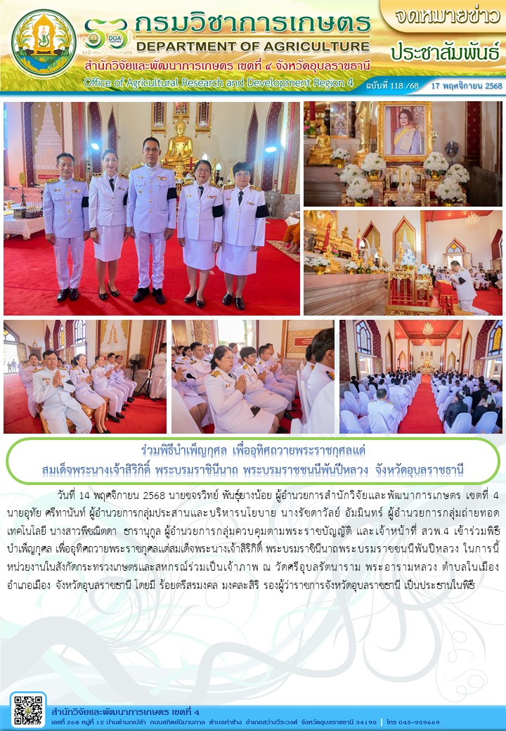 ข่าวกิจกรรม ร่วมพิธีบําเพ็ญกุศล เพื่ออุทิศถวายพระราชกุศลแด่ สมเด็จพระนางเจ้าสิริกิติ์ พระบรมราชินีนาถ พระบรมราชชนนีพันปีหลวง จังหวัดอุบลราชธานีโดย กิตติภัทร บุคจำปา วันที่ 17 พฤศจิกายน 2568 6 อ่านเพิ่มเติม→