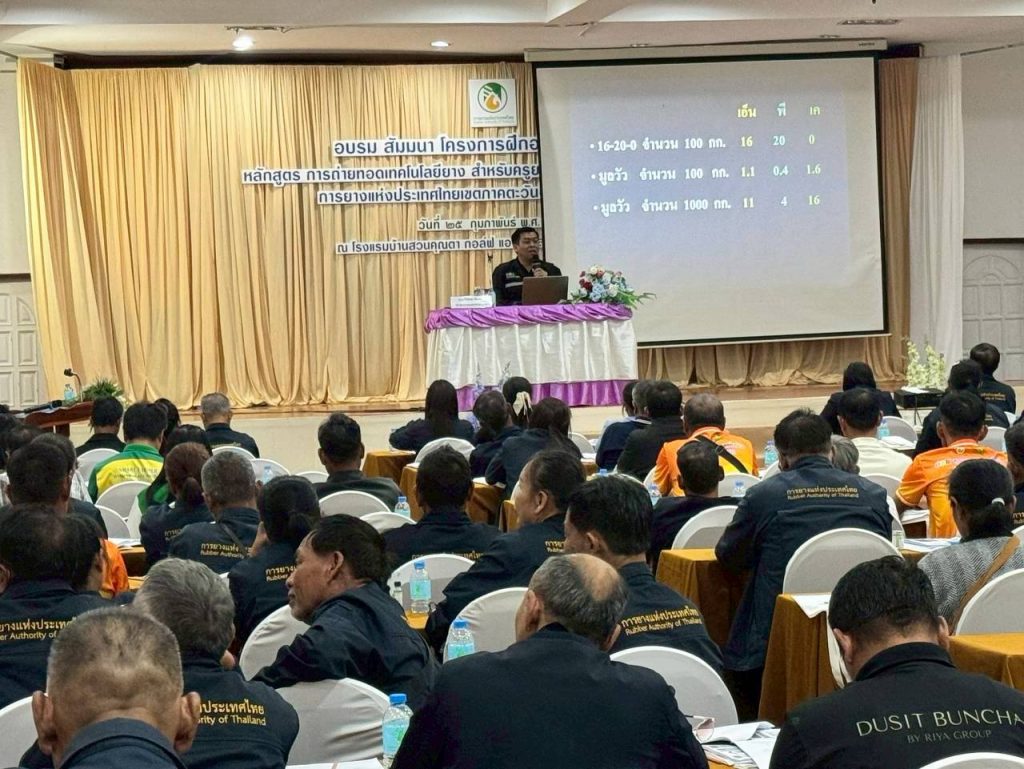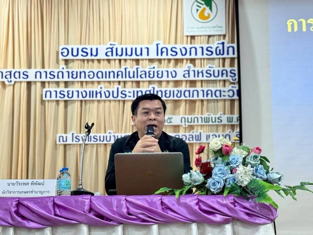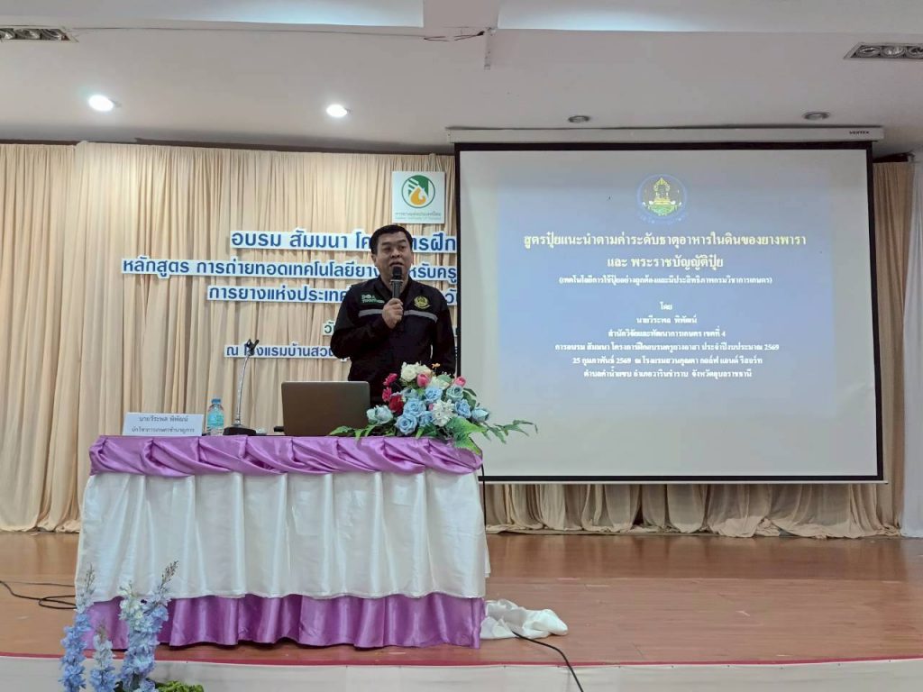 วันที่ 25 กุมภาพันธ์ 2569 นายขจรวิทย์ พันธุ์ยางน้อย ผู้อำนวยการสำนักวิจัยและพัฒนาการเกษตร เขตที่ 4 มอบหมายกลุ่มควบคุมตามพระราชบัญญัติ โดยนายวีระพล พิพัฒน์ นักวิชาการเกษตรชำนาญการ เป็นวิทยากรบรรยายในการอบรม สัมมนา โครงการฝึกอบรมครูยางอาสา หลักสูตร การถ่ายทอดเทคโนโลยียางสำหรับครูอาสายาง ประจำปี 2569 ในหัวข้อ สูตรปุ๋ยแนะนำตามระดับธาตุอาหารในดินของยางพารา และพระราชบัญญัติปุ๋ย (ฉบับล่าสุด)ให้แก่ครูยาง และพนักงานในสังกัด กยท.ข.อนล. จำนวน 114 คน ซึ่งมีวัตถุประสงค์เพื่อเพิ่มพูนความรู้ในการปฏิบัติสนับสนุนขับเคลื่อนภารกิจของการยางแห่งประเทศไทย และเพิ่มขีดความสามารถในการปฏิบัติงานด้านยางพาราที่เกี่ยวข้องให้ครูยางอาสา สามารถนำความรู้และความเข้าใจไปปฏิบัติงานตามที่ได้รับมอบหมาย ก่อให้เกิดประโยชน์ทั้งทางด้านการพัฒนายางพารา และสร้างโอกาสให้ครูยางได้แลกเปลี่ยนประสบการณ์ เพื่อปฏิบัติงานในทิศทางเดียวกัน ณ โรงแรมบ้านสวนคุณตา กอล์ฟ แอนด์ รีสอร์ท ตำบลคำน้ำแซบ อำเภอวารินชำราบ จังหวัดอุบลราชธานี